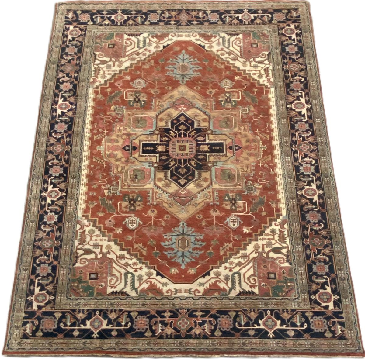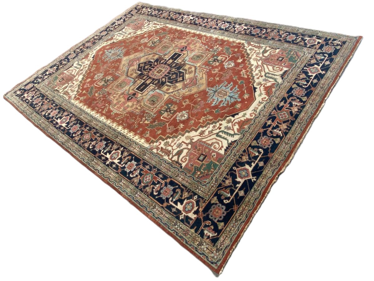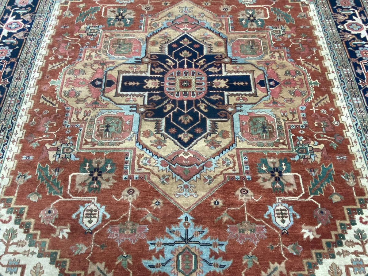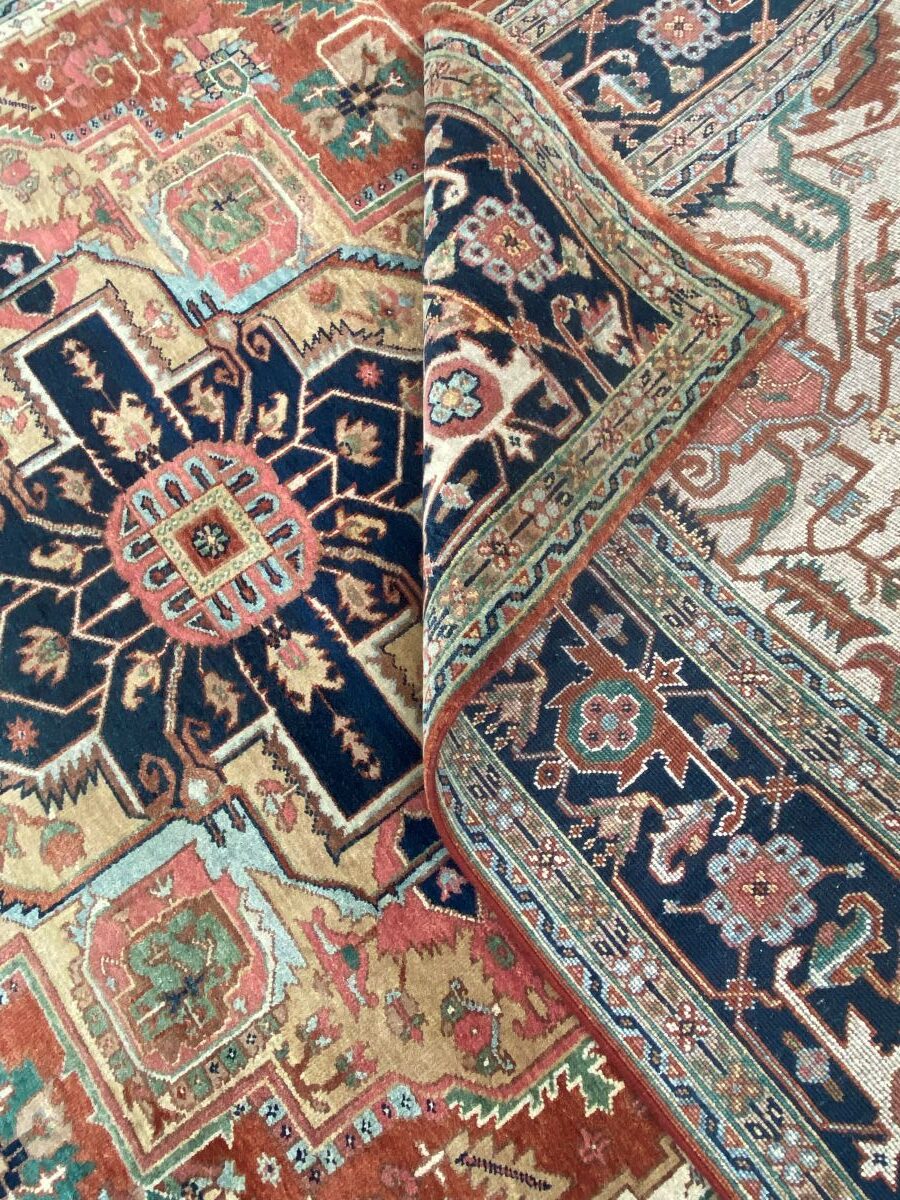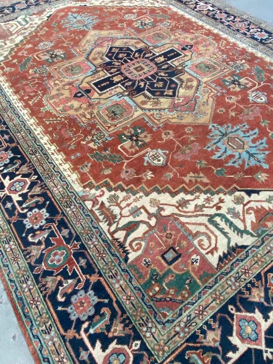 100% dense & plush hand-spun woollen pile with natural dyes. Hand-knotted weave with traditional HERIZ design of a dominant bold angular medallion in a field of bold palmettes and oak leaves. Border of Herati motifs and rosettes. The entire in hues of terracotta, indigo, blue, green & beige. Gallery exhibited. New and in pristine condition.
