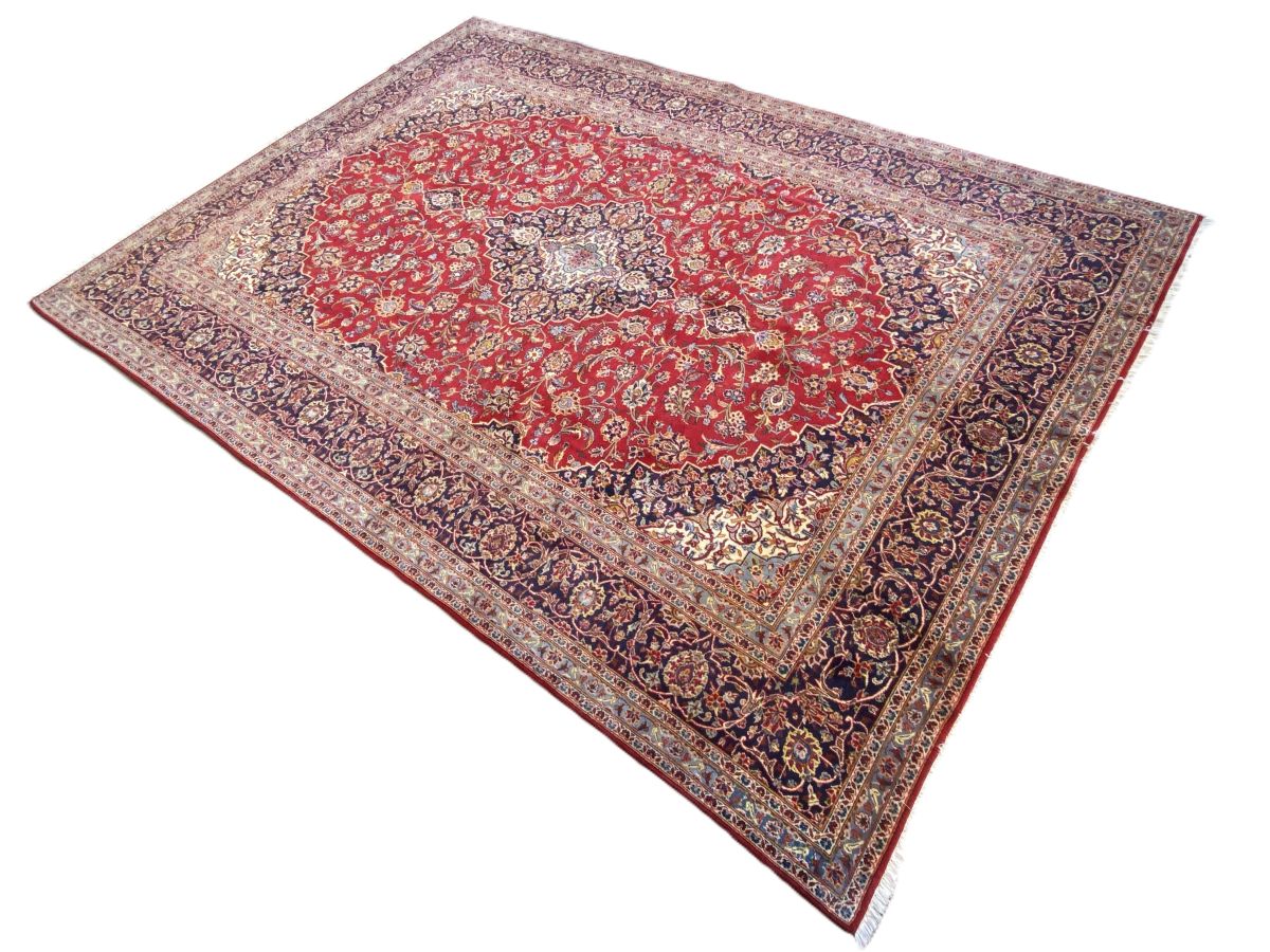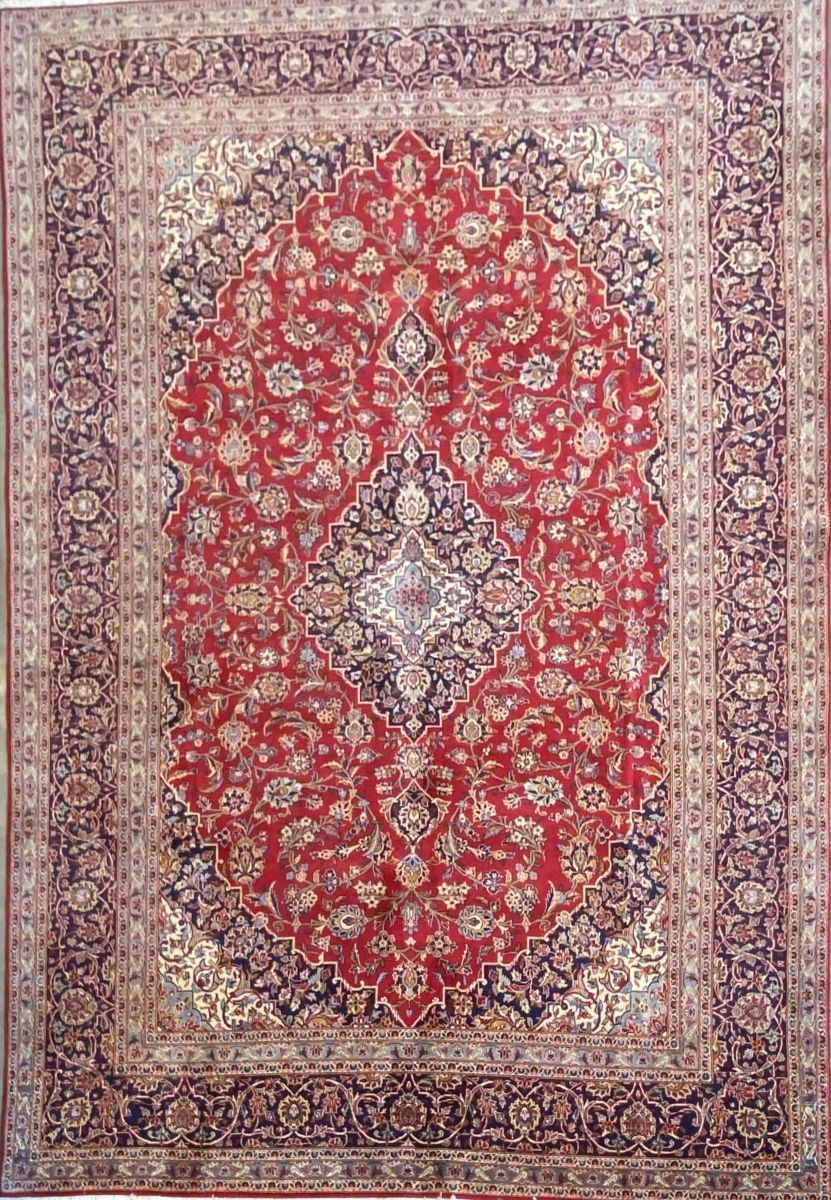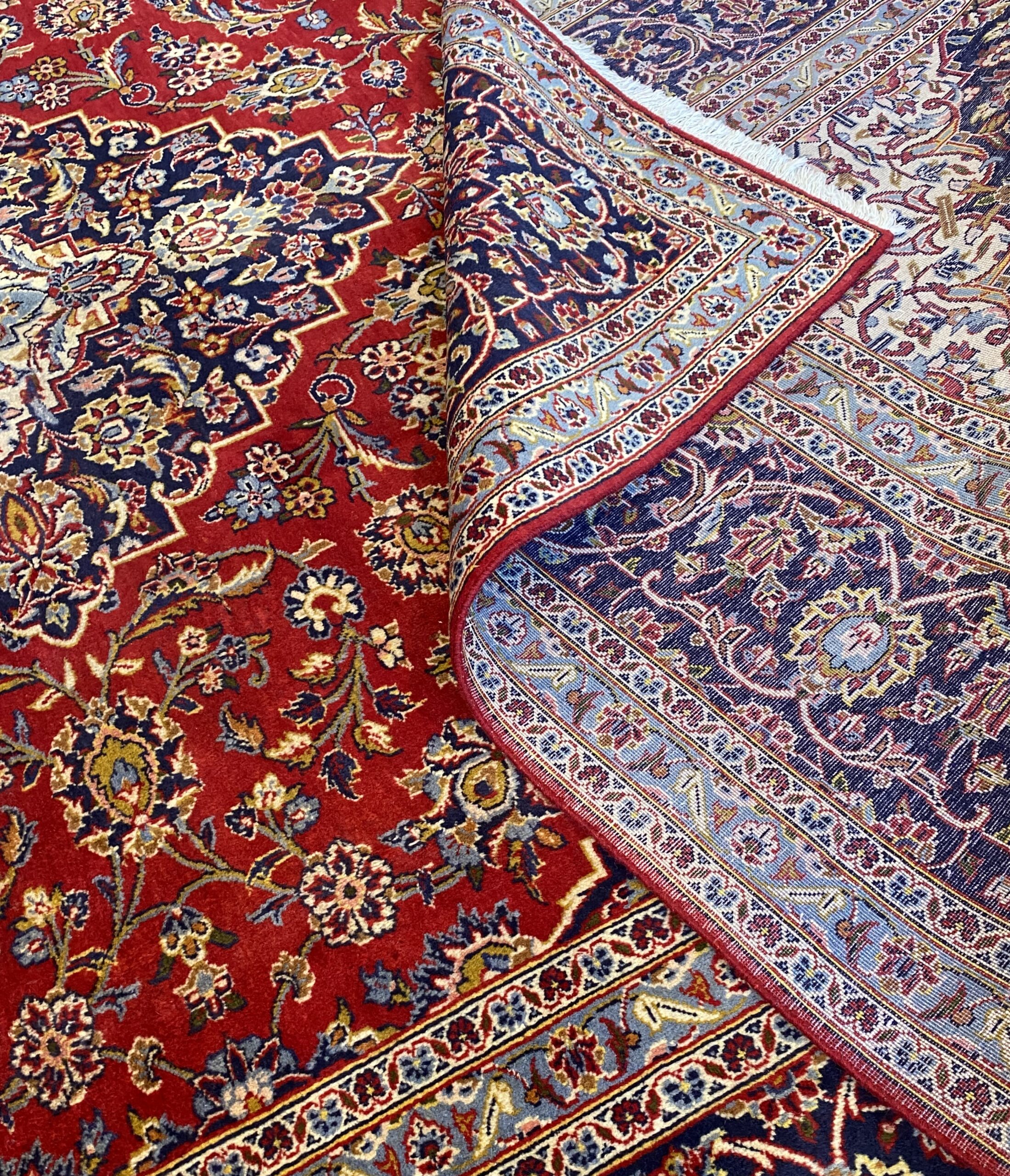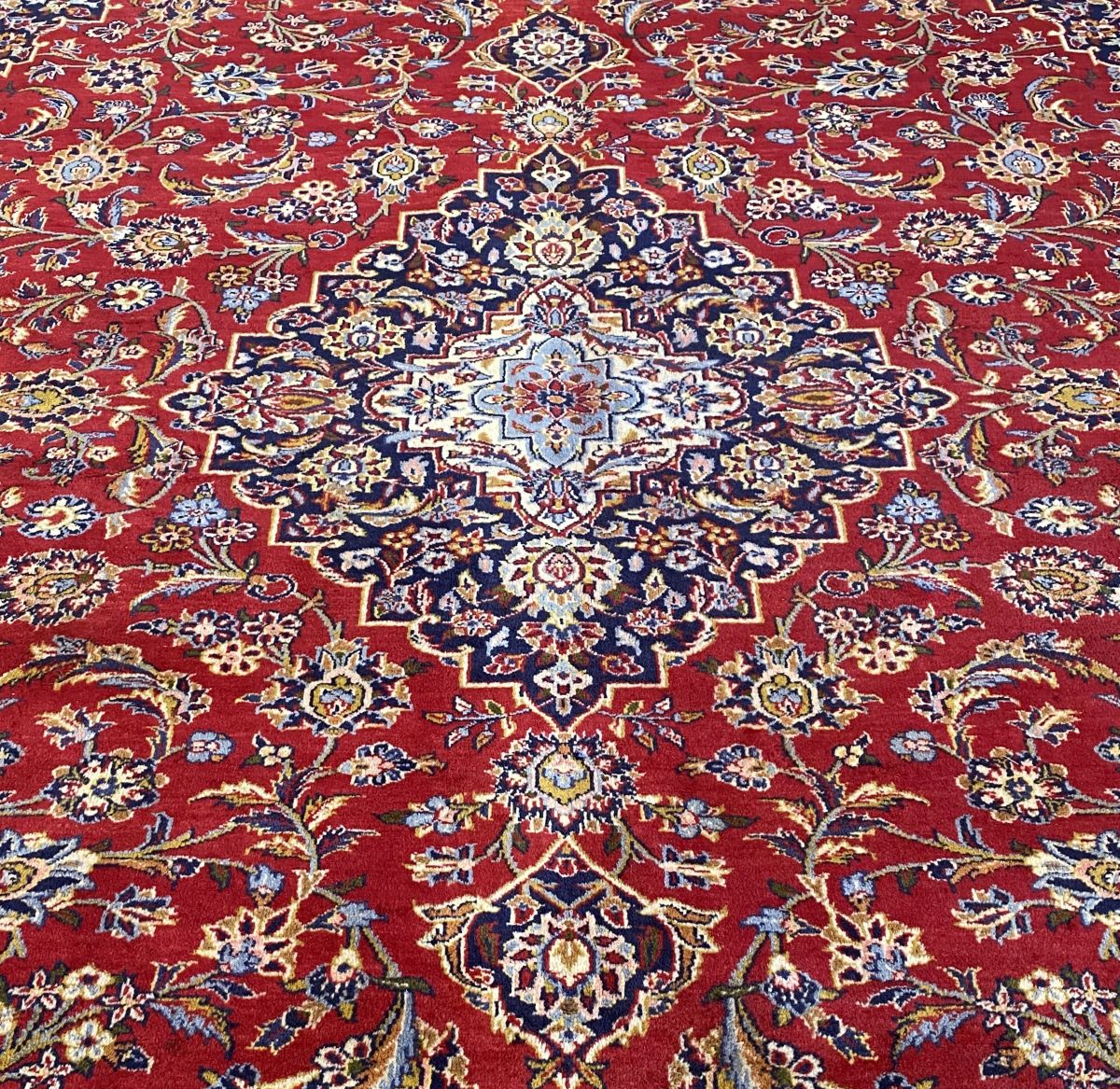 100% dense woollen pile. hand-knotted city weave from north Isfahan province with classic Kashan book cover design of elongated chandelier medallion in indigo, cornflower blue & cream hues in a ruby red field of Shah Abbassi palmettes, floral sprays & flower heads. Major border of palmettes & Saz leaves. Minor borders of flower heads. The most durable of all Persian rugs.