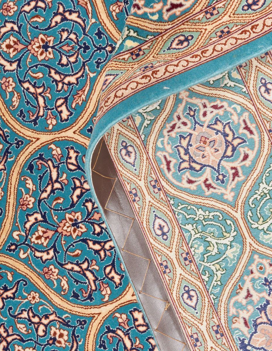 Pure silk foundation. High quality lamb’s wool (kork) pile. Heavily inter-knotted with silk. finely hand-knotted weave of 750,000 knots per square meter by “Davari” master weaving atelier. Signed piece. Classic Isfahan Gonbad (dome) design depicting the interior façade of mosque domes with a symmetrical design with patterns radiating outwards from the central medallion and featuring Shah Abbassi palmettes & tendrils. The entire in shades turquoise, champagne, ivory, spring green & peach. Isfahans are known for their superb workmanship. gallery exhibited. in pristine condition.