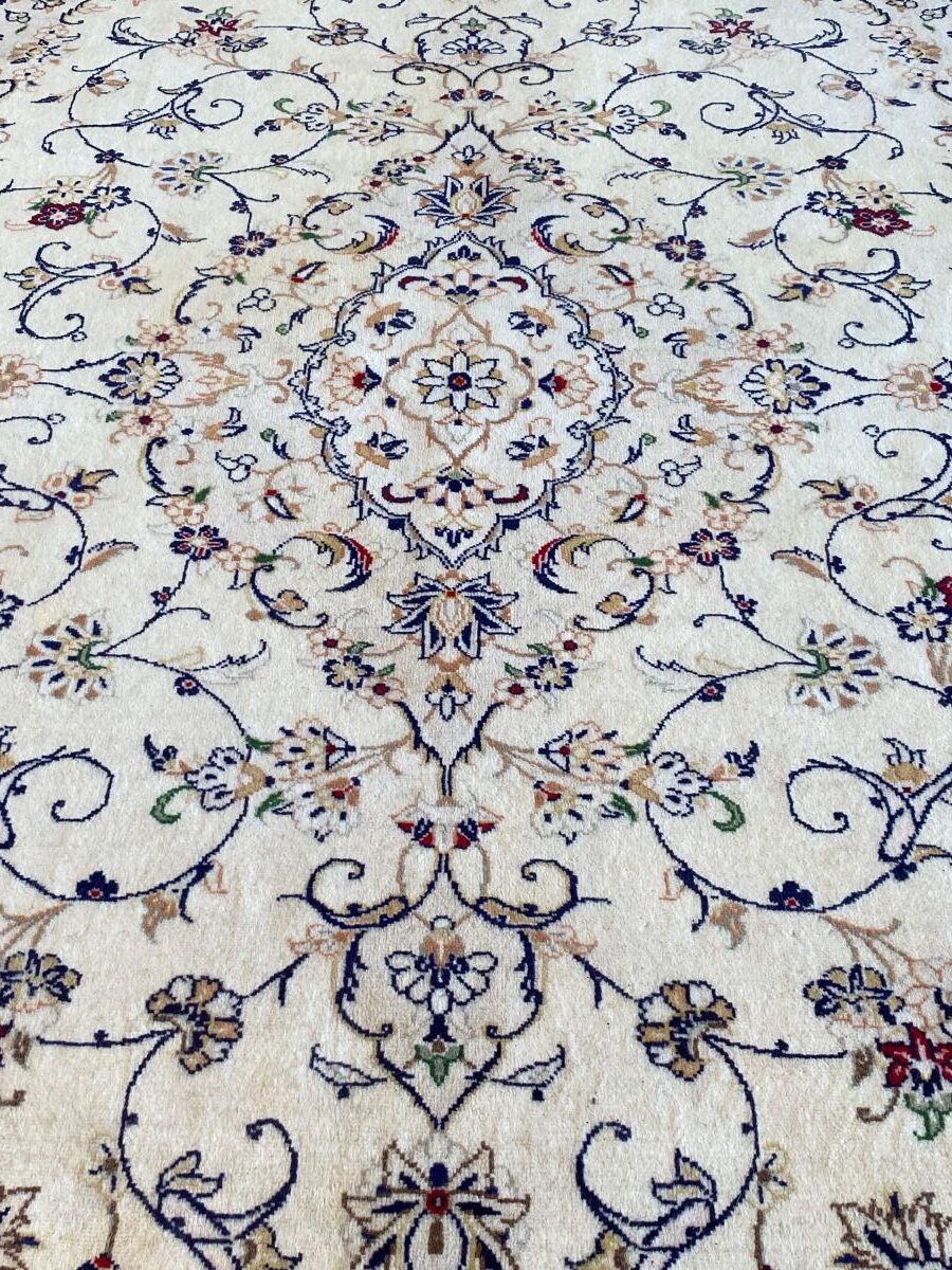 100% fine woollen pile. Finely hand-knotted with classic Kashan book cover design of a chandelier medallion & quartered corner medallions within a field of arabesque scrolls, flower heads and Saz leaves. Border of palmettes & floral sprays. The entire in hues of cream, indigo, light pistachio with burgundy highlights. The most durable of all Persian rugs.