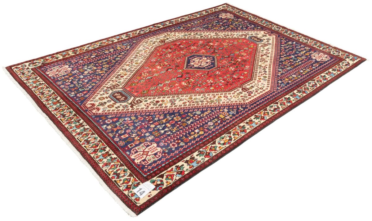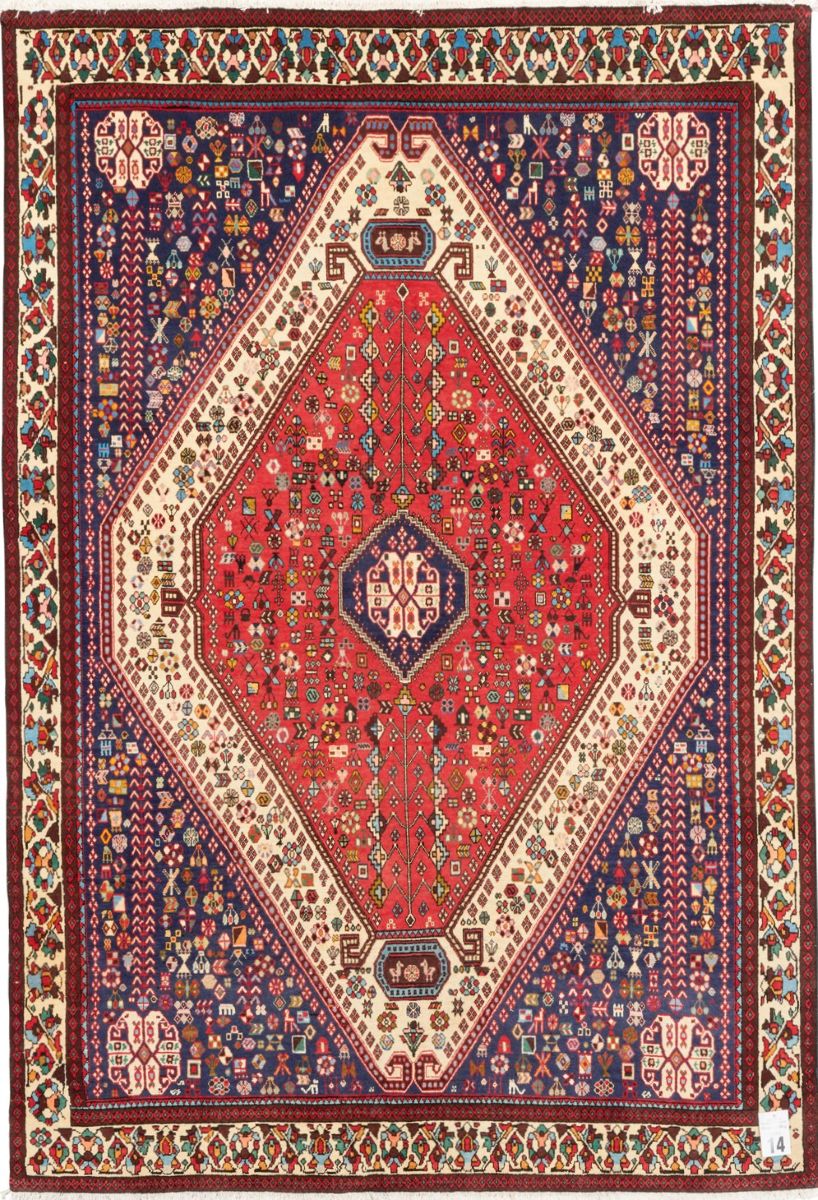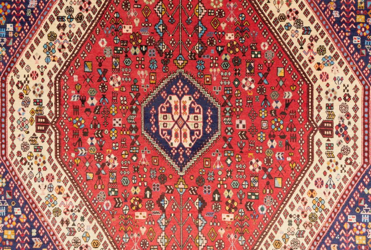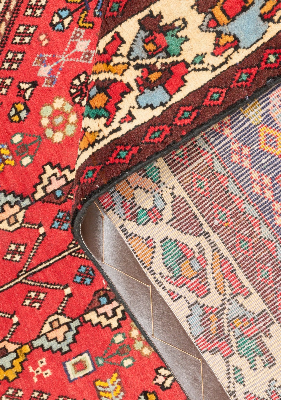 100% wool. Solid & plush pile. Finely hand-knotted village weave from the Fars province with tribal design of a hexagonal medallion containing an amulet & quartered corner medallions in a primary red & secondary cream field of double continuous geometric trailing flower head and leaf sprig patterned “trees of life” flanked by secondary intricate floral motifs, geometric patterns & bird, cat & human forms. Major border of palmettes & leaf forms.