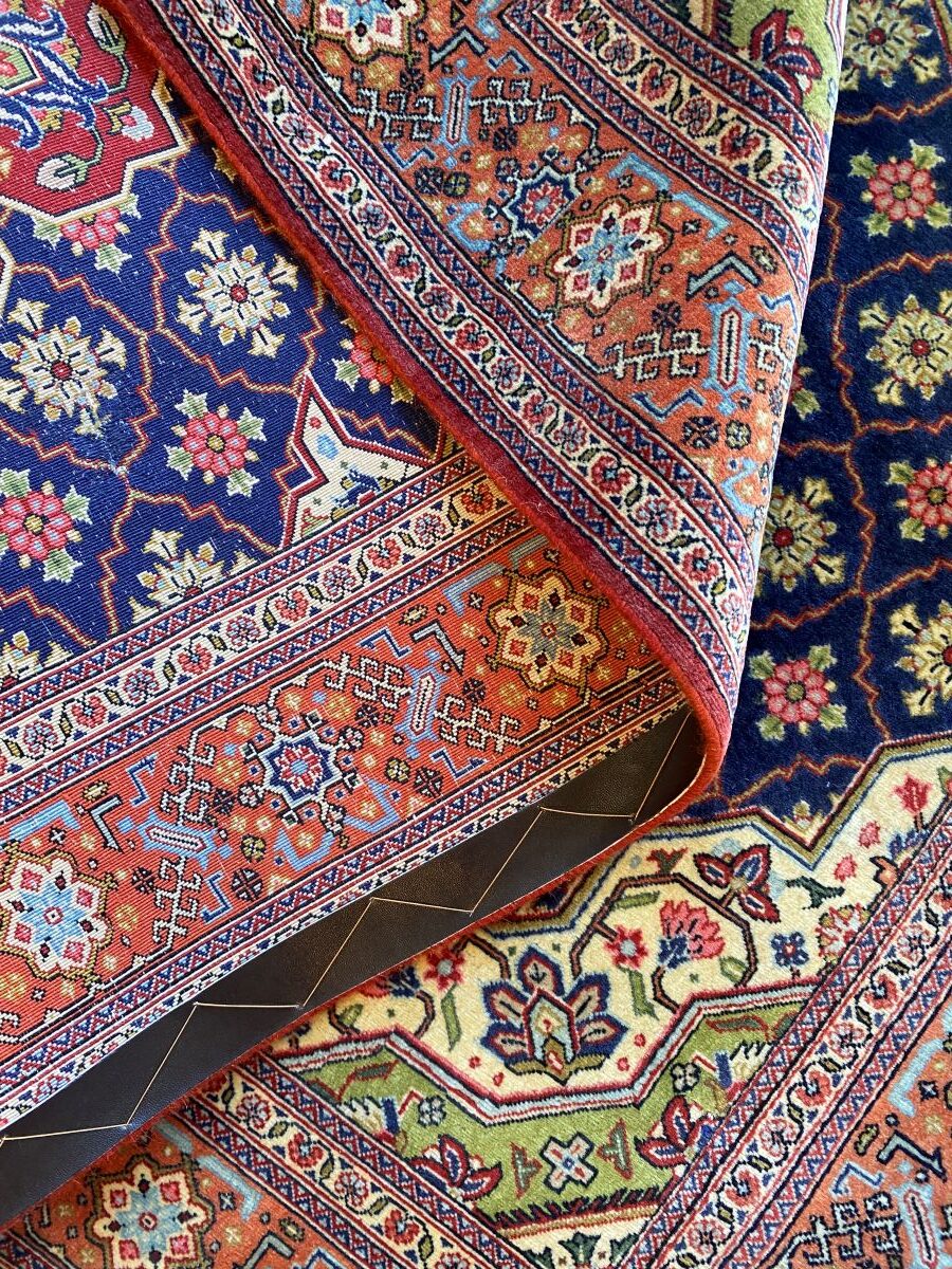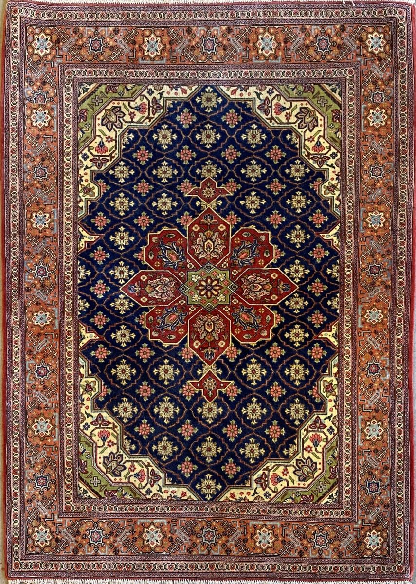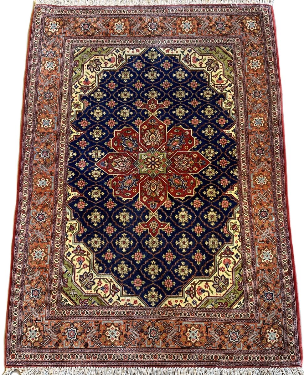100% lamb’s wool (kork) pile. Finely hand-knotted with a unique Qum design of a stylized medallion containing palmettes & quartered corner medallions in a panelled field of floral motifs & tendrils. Border of palmettes. The entire in hues of indigo, cream, terracotta, burgundy & green. In pristine condition.