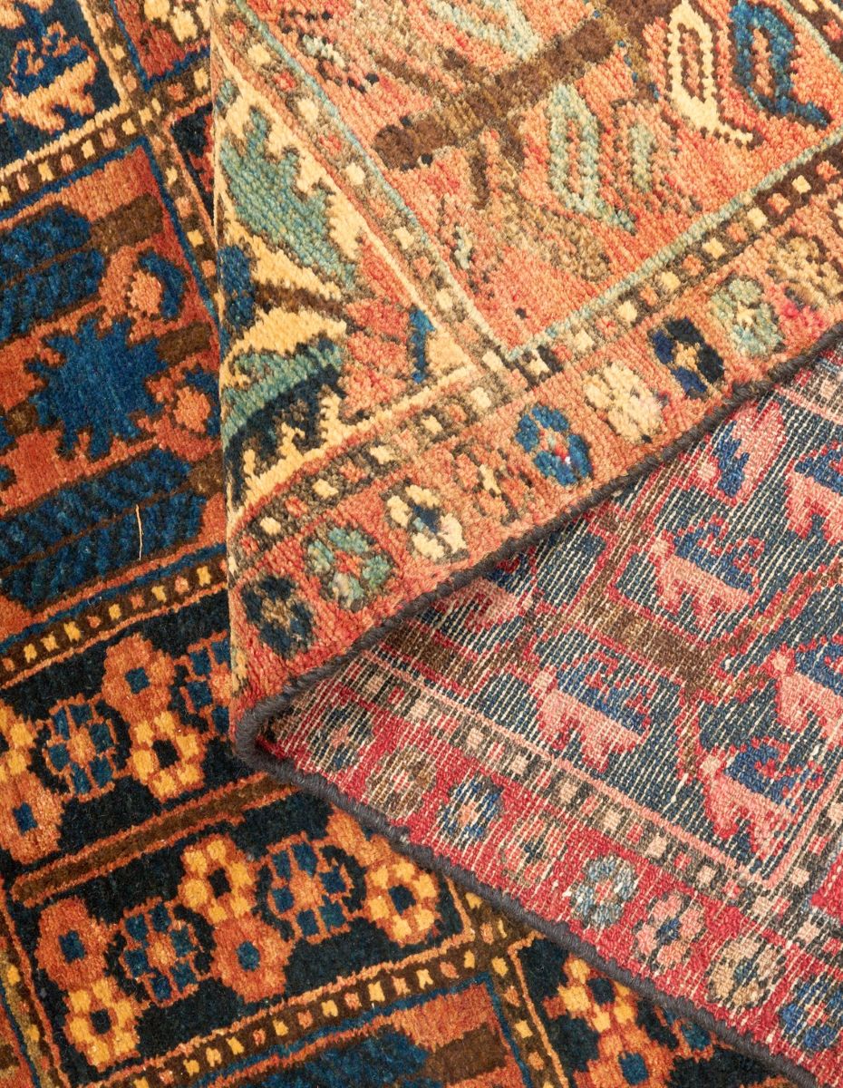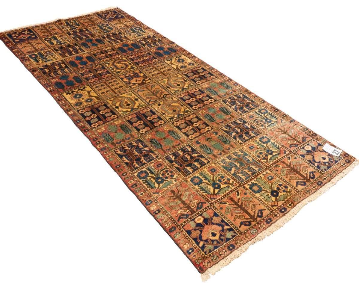 100% wool and natural dyes. Woven by the settled Bakhtiari tribe with a traditional garden design of square panels containing garden themes of willow & cypress trees, floral shrubs, autumn trees, urns bearing floral foliage & paisley motifs. The entire in shades of terracotta, blue, indigo, cream & green.