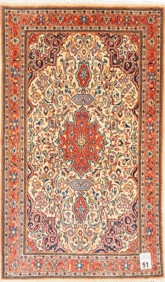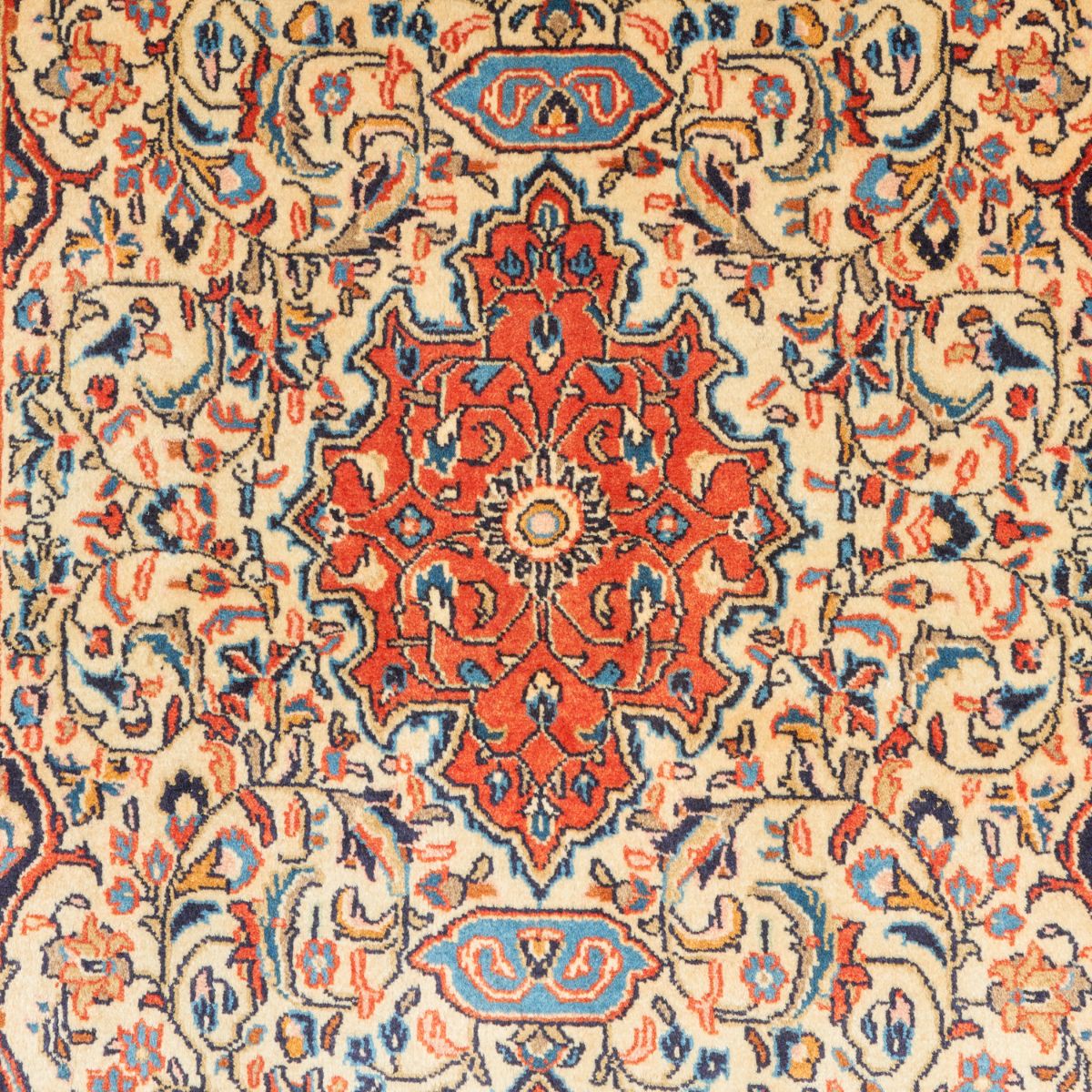 High quality plush wool pile. Hand-woven in the Arak region of central Iran with classic Persian design of elongated vermillion medallion in a cream field of palmettes and floral sprays. Border of palmettes & tendrils. Sarouq rugs are known for their exceptional quality and ability to withstand decades of wear.