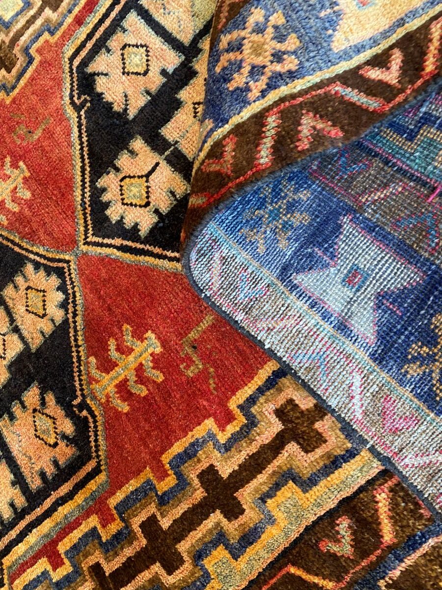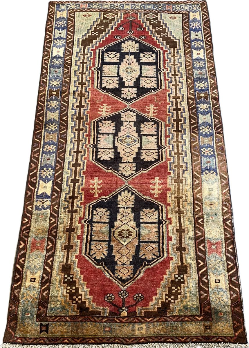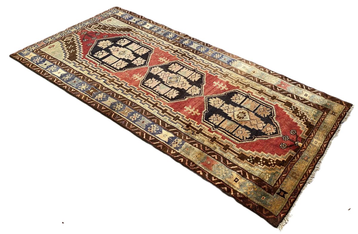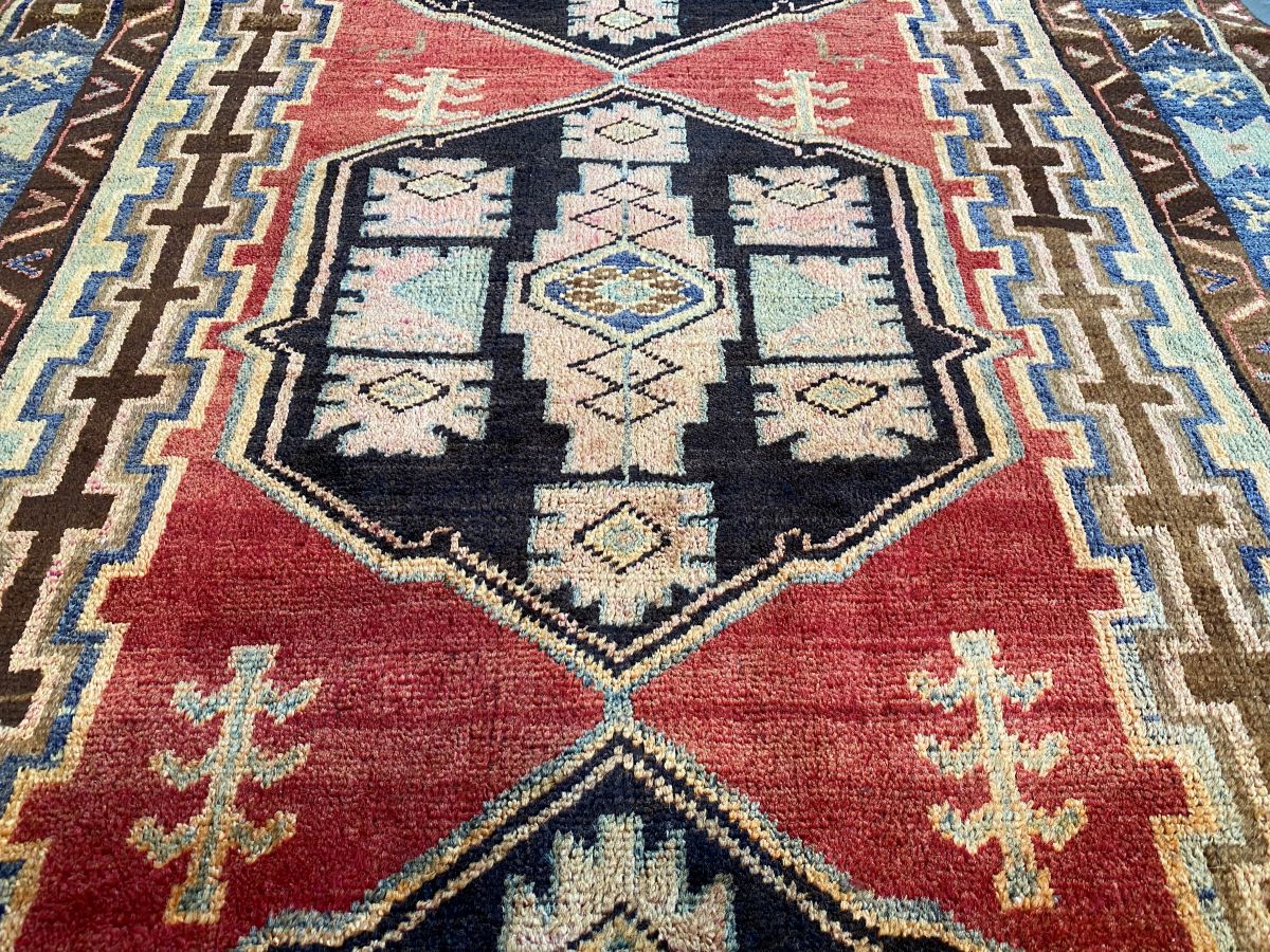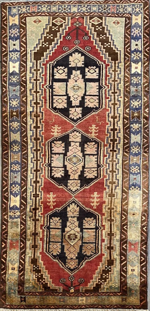100% wool pile and vegetable dyes & natural abrash colour variation. Hand-woven village weave from the east Azerbaijan province with Caucasian design of triple stylized medallions containing geometric patterns set against a border of geometric & tribal patterns.