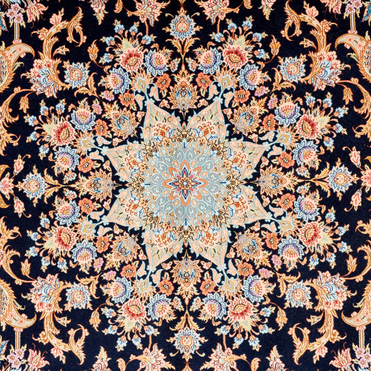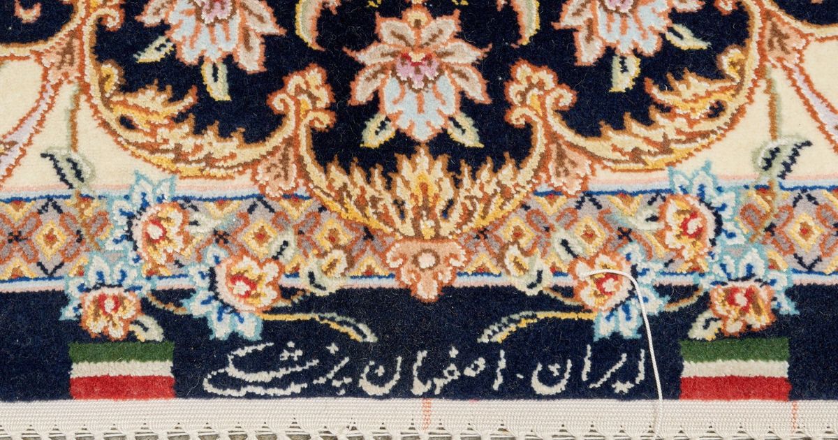 Pure silk foundation. High quality lamb’s wool (Kork) pile Heavily inter-knotted with silk. Finely hand-knotted weave of 800,000 knots per square meter by “Pezeshki” master weaving atelier. Signed piece. Rare Isfahan design of floral medallion comprising palmettes & lotuses in a field of elaborate bold floral bouquets & paisley motifs. Border of cartouches, palmettes, lotuses & intricate tendrils. The entire in shades of onyx, lilac, cornflower blue, rose, spring green with gold highlights. Isfahans are known for their superb workmanship. Gallery exhibited. In pristine condition.