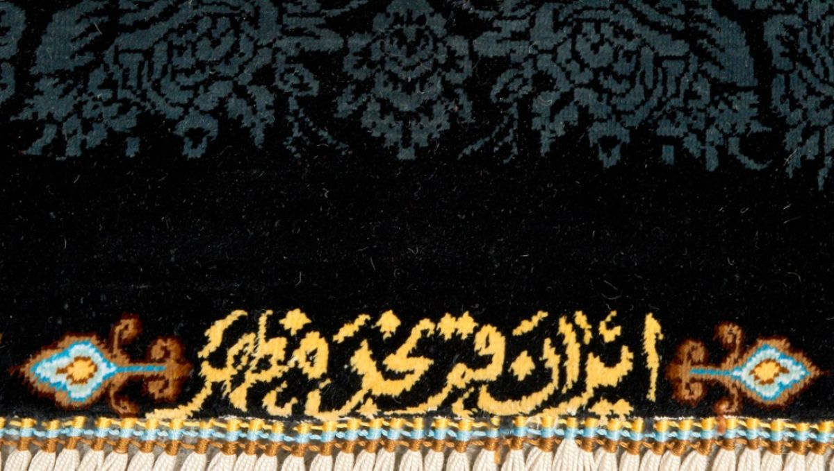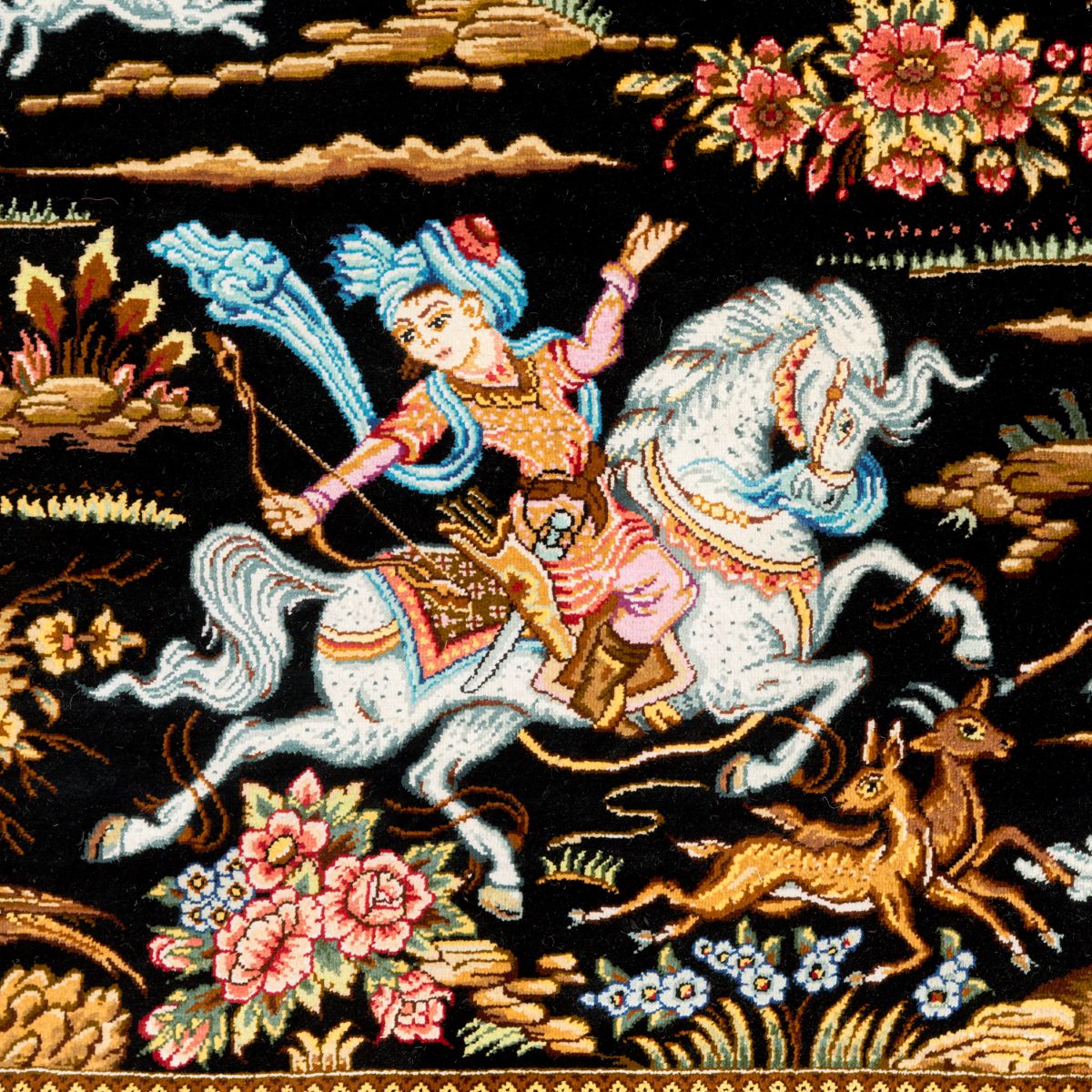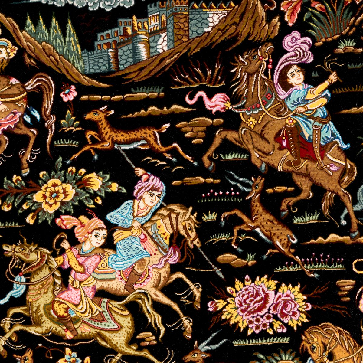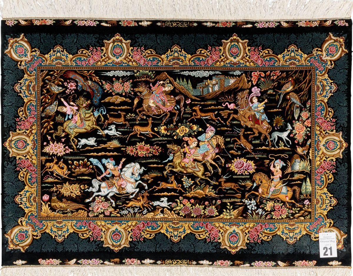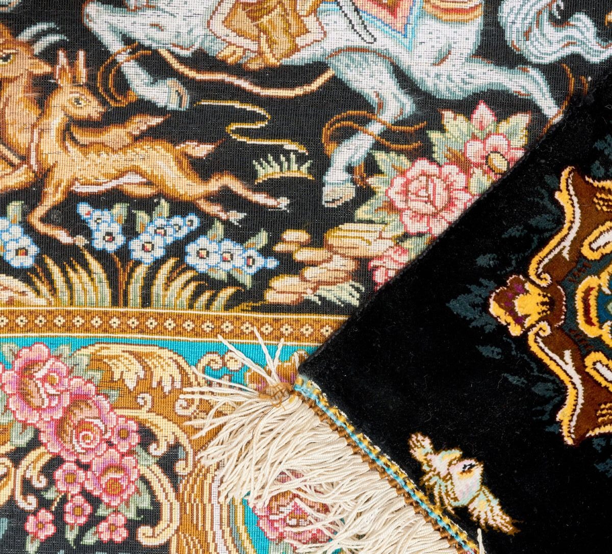 100% pure Caspian silk. Superbly hand-knotted weave of 750,000 knots per square meter by “Najaf Mazhari” master weaving atelier. Signed piece. Classic Qum pictorial design of intricately detailed royal princes astride horses in a field of secondary floral shrubs & trees, gazelles, hares, pheasants, goats & peacocks framed by an elaborate floral border and intricate floral patterns and bird & gazelle forms the entire in shades of onyx, ivory, champagne, rose, Persian blue & chestnut brown with golden highlights. Silk carpets from Qum are known for their superb workmanship. Gallery exhibited. New & in pristine condition.
