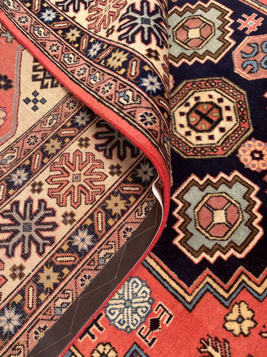 100% fine & dense wool pile. Hand-knotted city weave from the Ardebil province with Caucasian-influenced design of triple hexagonal medallions containing tribal motifs set within a field of tree of life forms, flower heads & geometric patterns. Border of rosettes. The entire in subtle shades of peach, cream, cornflower blue & indigo. In superb condition.
