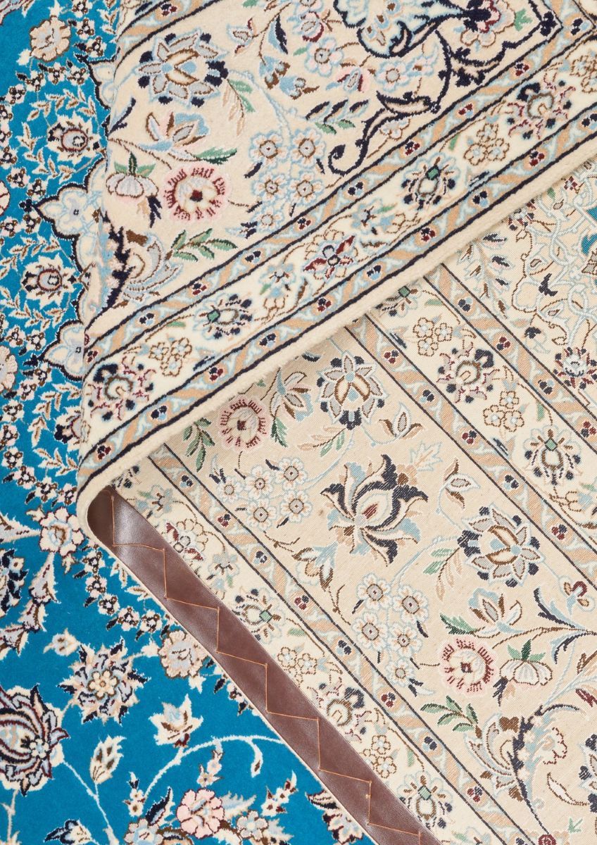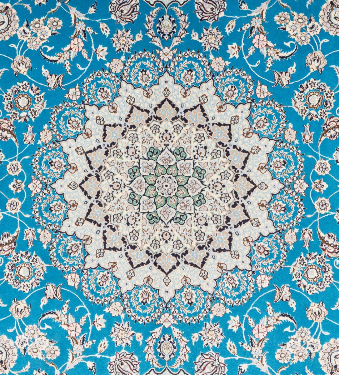 High quality lamb’s wool (Kork) pile inter-knotted with silk inlays. Finely hand-knotted weave of approximately 680,000 knots per square meter by “Habibian” master-weaving atelier. Signed piece. classic NAIEN design of a 16-point sunburst medallion with palmettes & floral sprays & quartered corner medallions in a field of palmettes, blossoming floral sprays and tendrils. Border of palmettes, floral sprays & Saz leaves. The entire in shades of cerulean, cream, taupe, cornflower blue & indigo. Carpets from NAIEN are famous for their fine craftsmanship.
