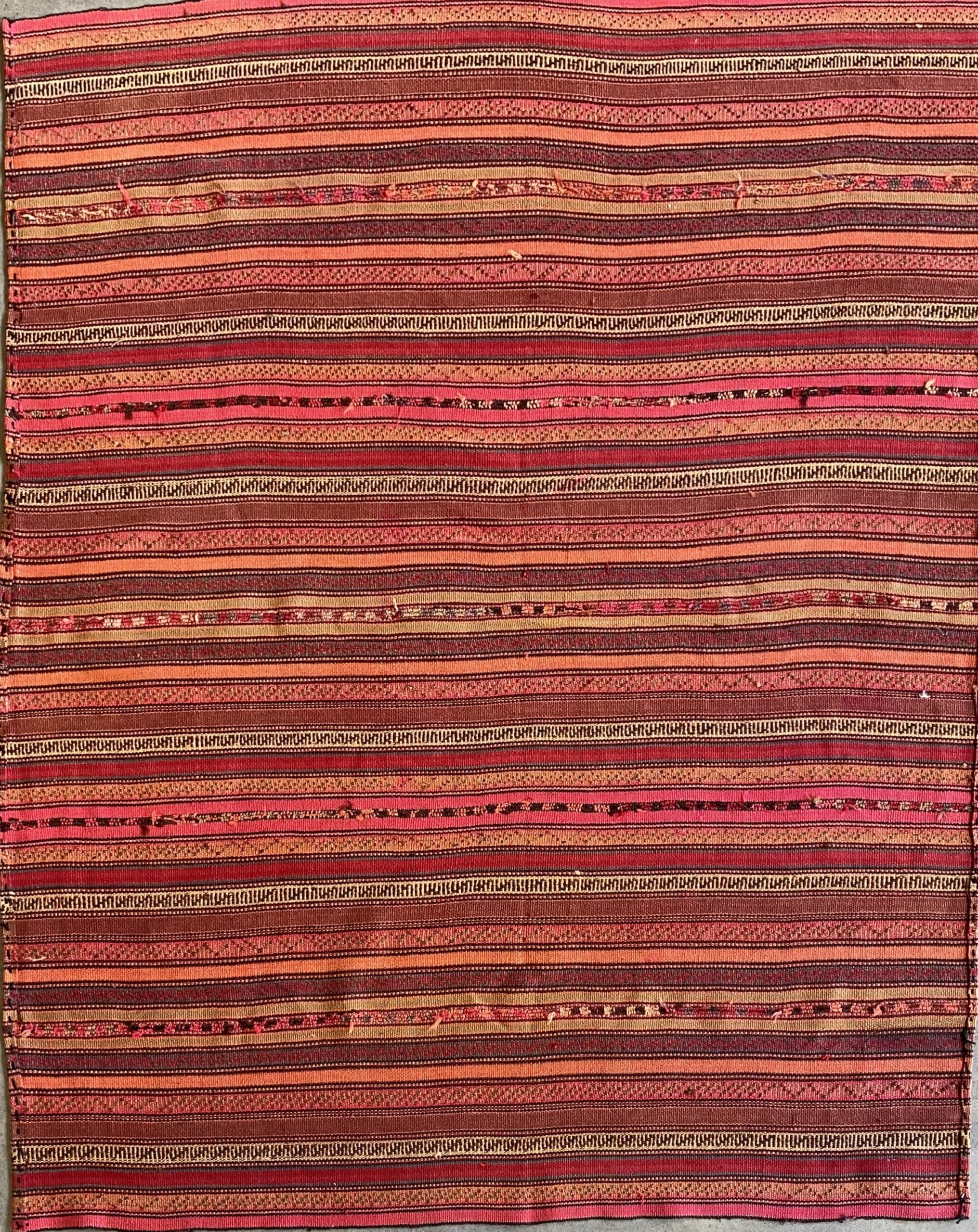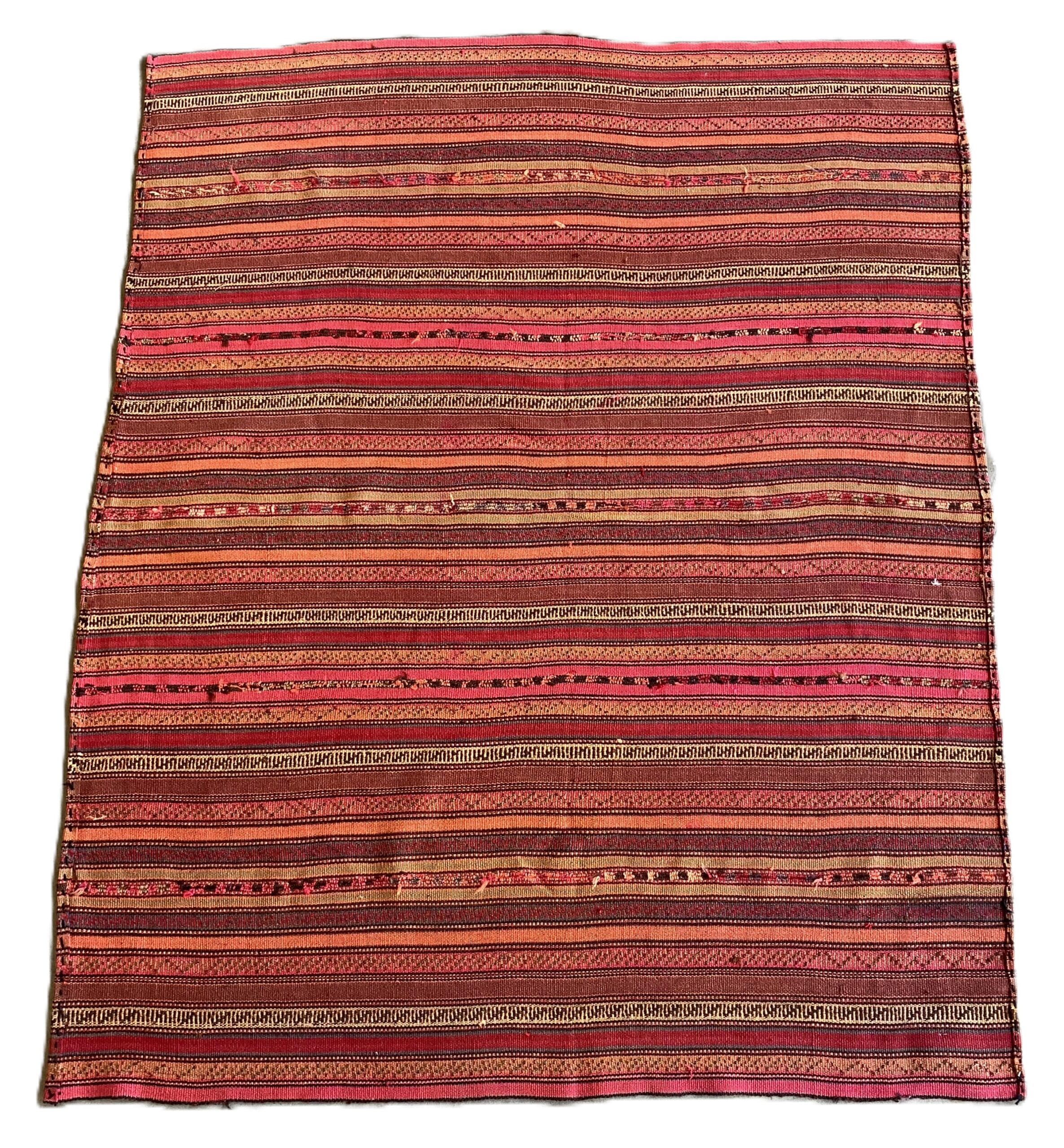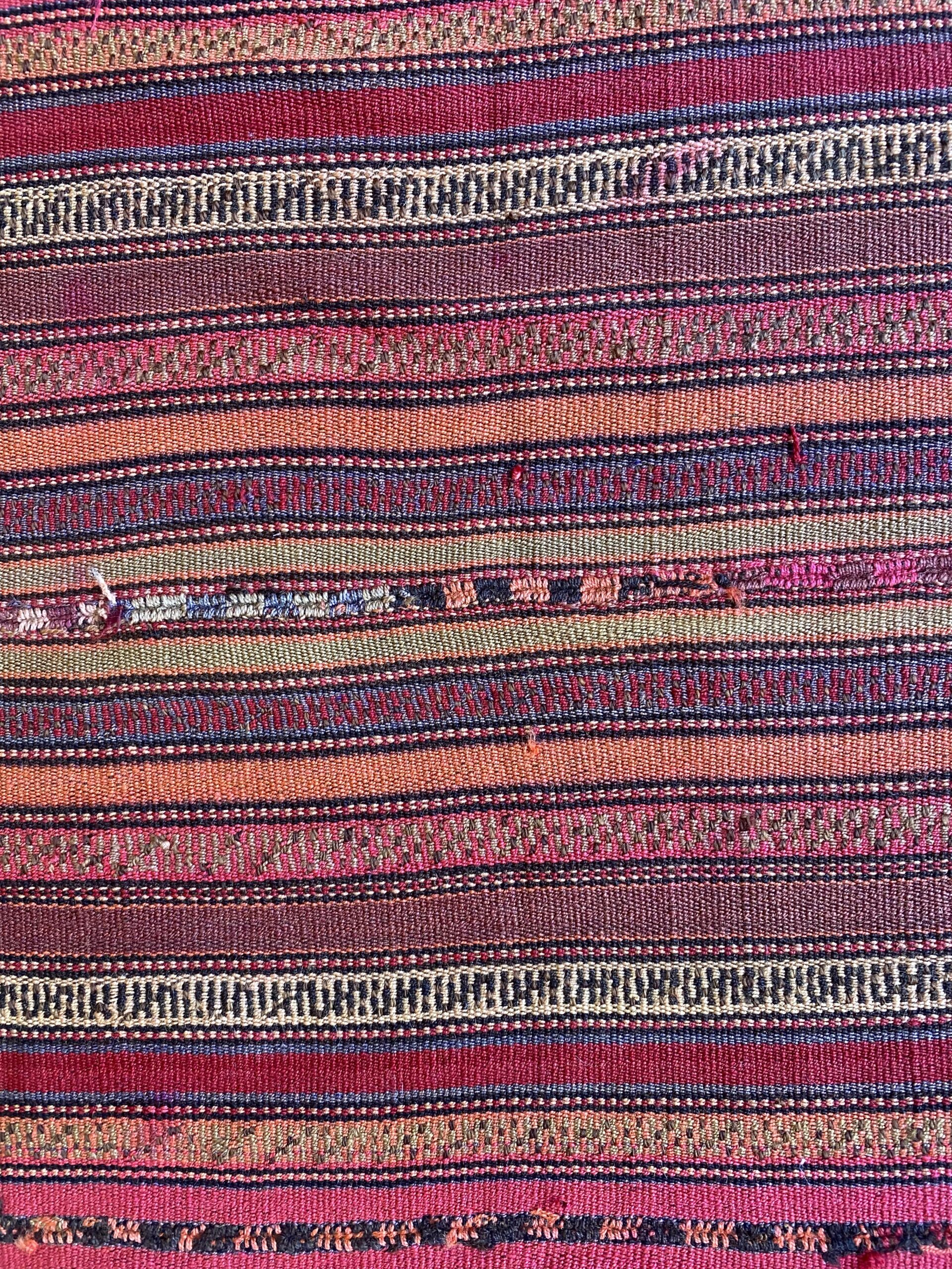 100% wool. Hand-woven tribal weave in varying shades of red, green & saffron. Jajims are flatweaves used as carpets, curtains, bed & furniture covers.