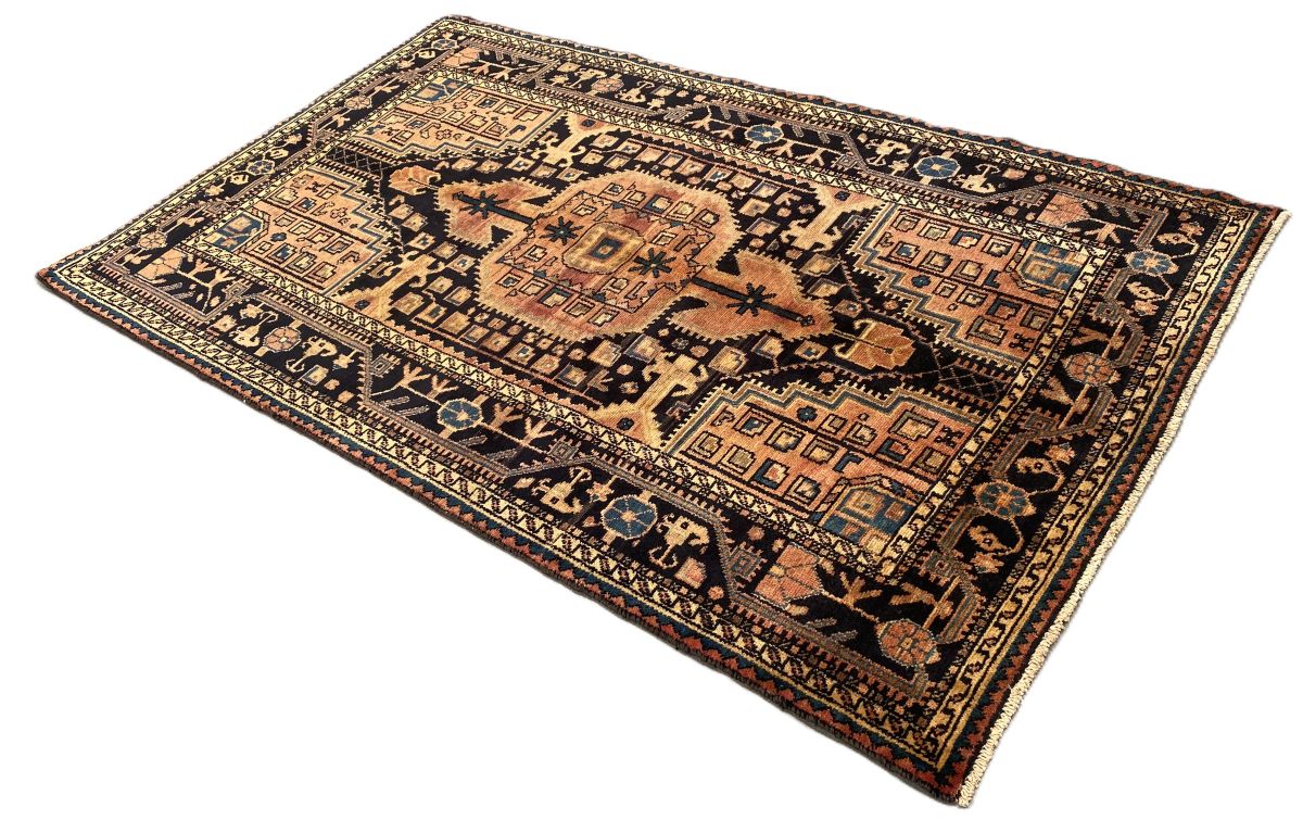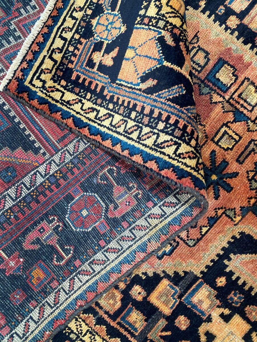 100% wool & vegetable dyes with Abrash discolouration. Hand-knotted village weave from the Hamadan region with a distinct design of central anchored medallion & corner medallions in a field of angular floral motifs. Border of rosettes & geometric patterns. All over colour tones of indigo, cream and rust.