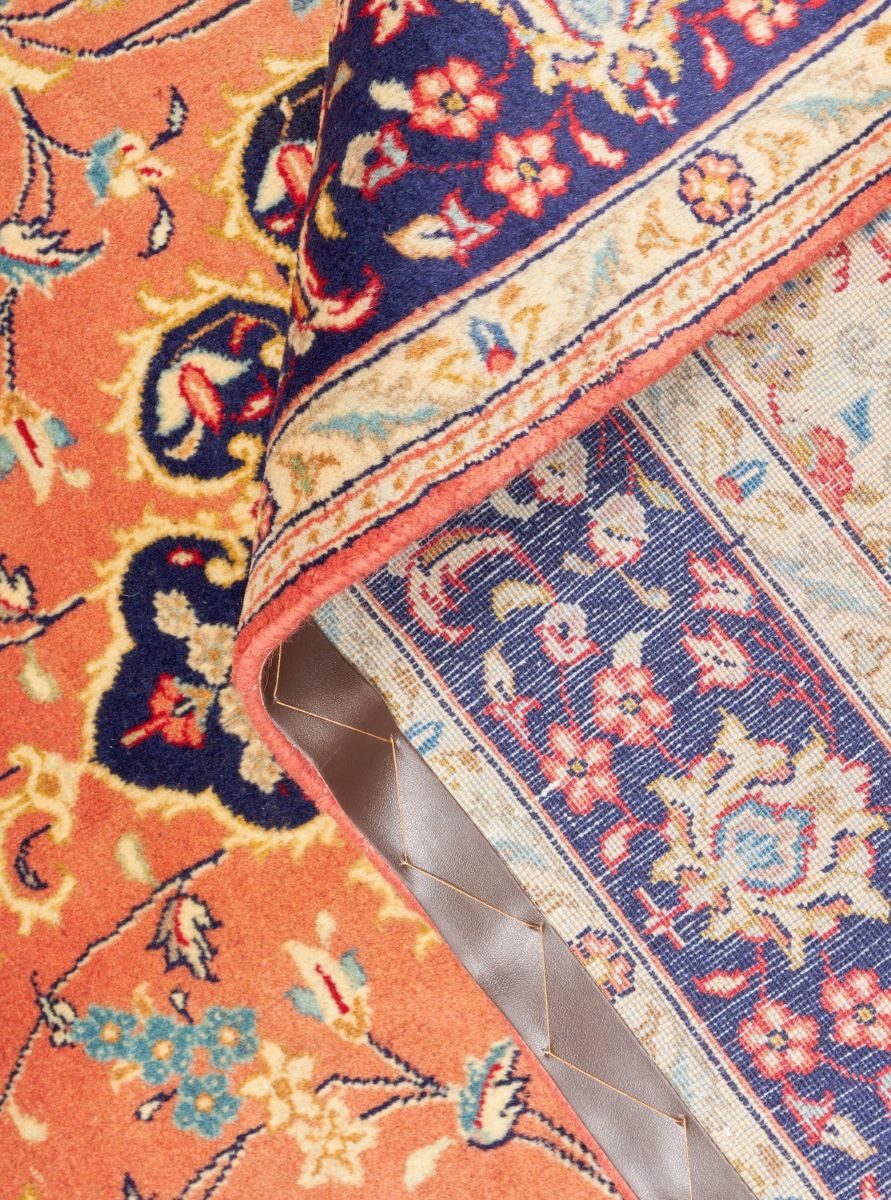100% fine wool pile. City weave from the north Isfahan province. classic Kashan book cover design with an elongated chandelier medallion & quartered corner medallions in a field of palmettes, Arabesque Eslimi scrolls blossoming floral sprays & Saz leaves. Border of palmettes & intricate floral motifs. The entire in pastel tones of rose, blue & cream with indigo-toned medallion & border. High quality carpets renowned for their durability and longevity.