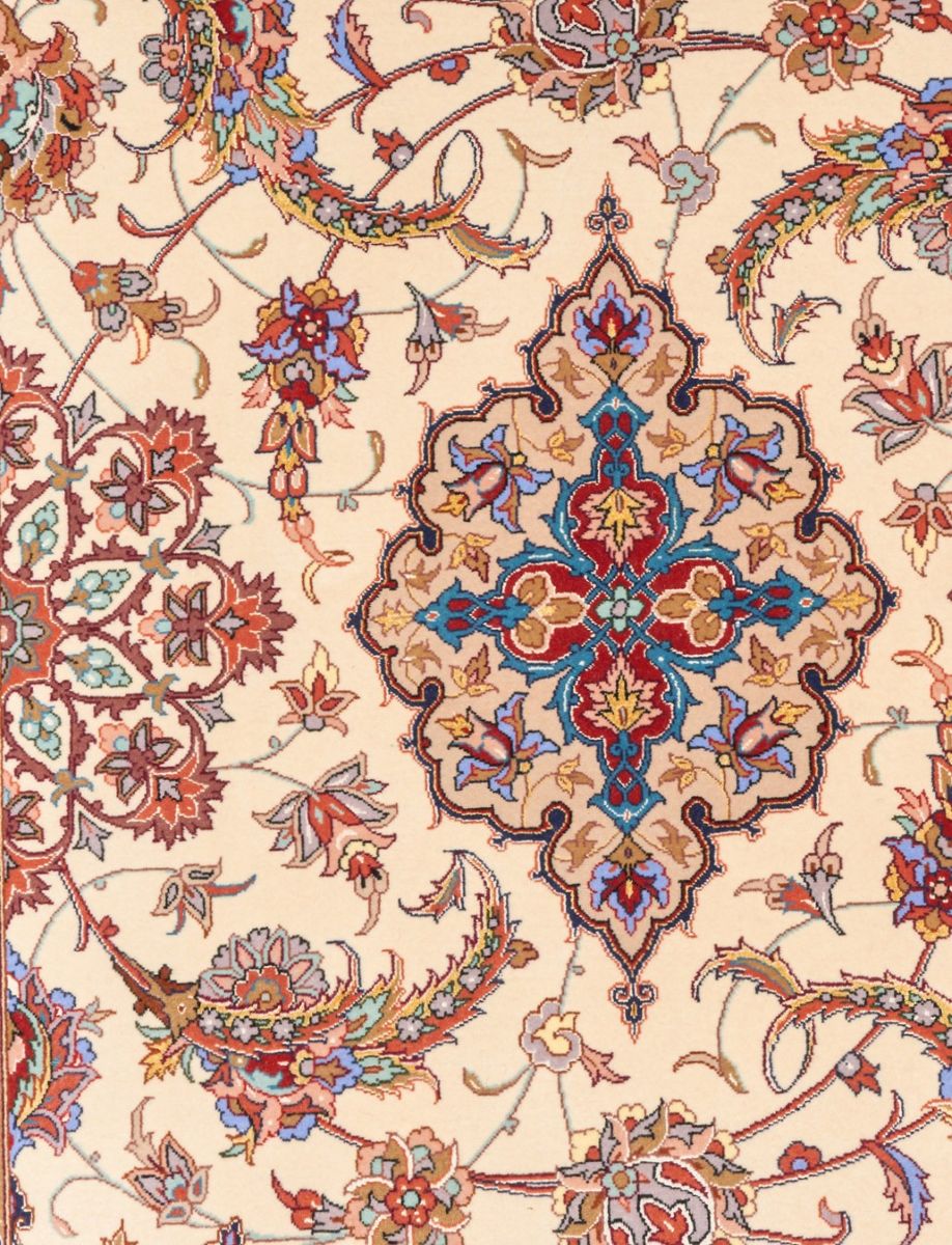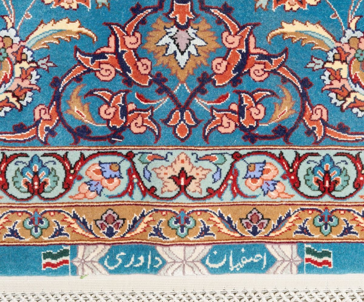 Pure silk foundation. High quality lamb’s wool (Kork) pile heavily inter-knotted with silk. Finely hand-knotted weave of 800,000 knots per square meter by “Davari” master weaving atelier. Signed piece. Unique Isfahan design of a 32-point sunburst medallion & corner medallions set against secondary chandelier & floral medallions & semi-medallions in a field of bold Shah Abbassi palmettes, floral motifs & elaborate Saz leaves. Wide border of Shah Abbassi palmettes, floral sprays & Aaz leaves. The entire in shades of ivory, cerulean, taupe, claret & cognac. Isfahans are known for their superb workmanship. Gallery exhibited. In pristine condition.