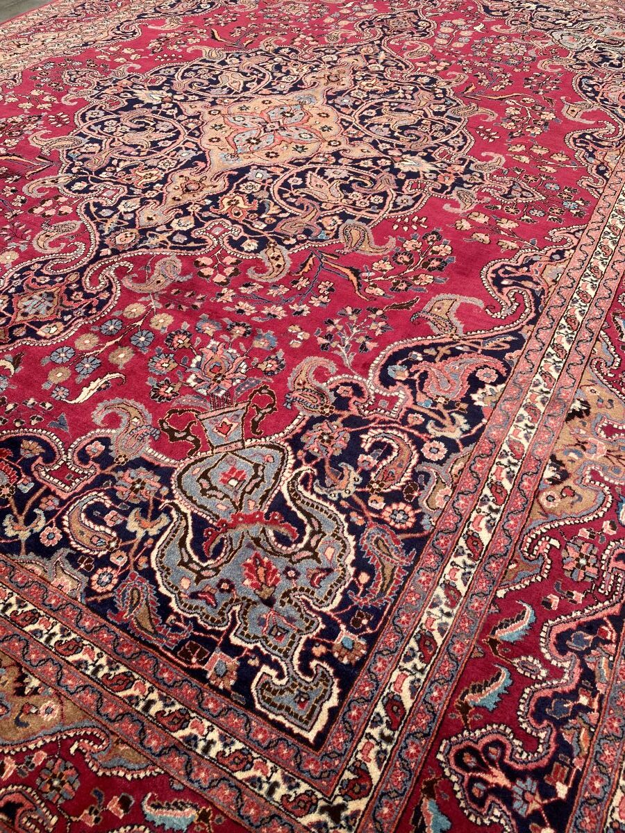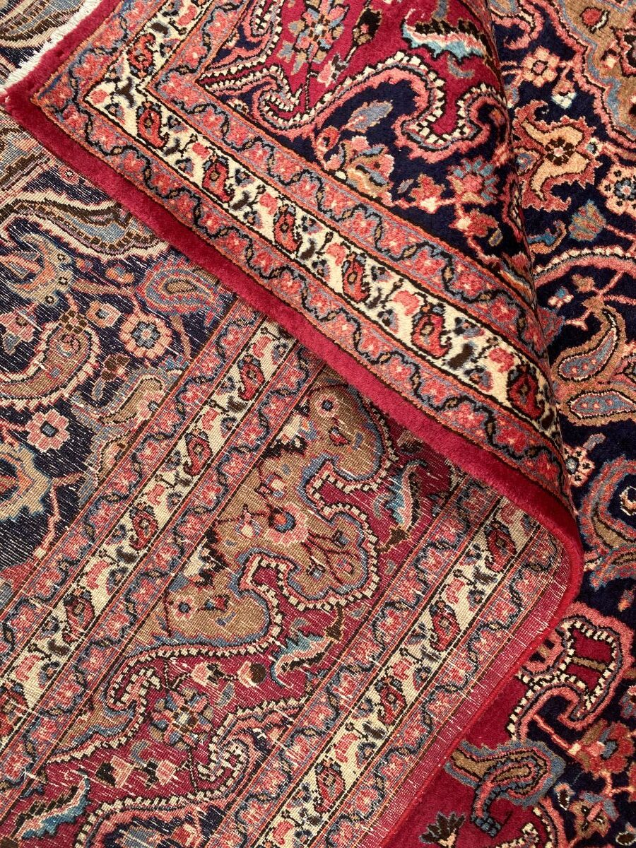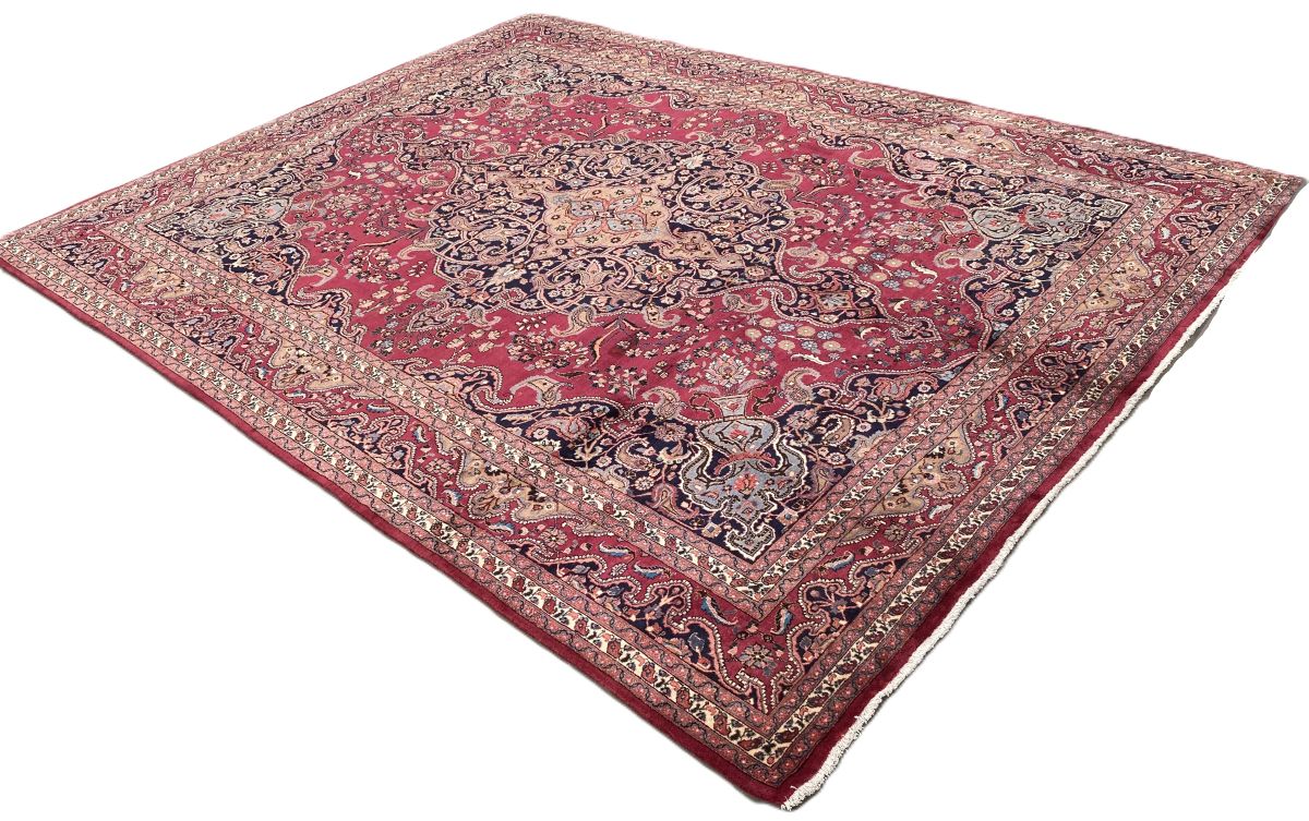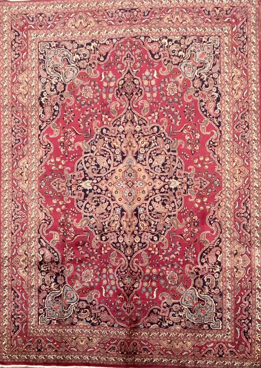 100% woollen pile. Hand-knotted city weave from the Khorasan province with floral design of a dominant elaborate medallion & quartered corner medallions with urns bearing floral foliage & paisley motifs in a crimson-toned field of floral sprays. Border of semi-medallions and tendrils. Professional minor restoration. Solid and excellent for high traffic areas.